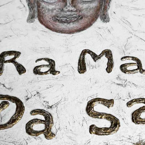 Im Mittelpunkt des Gemäldes trifft Dein Blick auf einen in sich ruhenden Buddha Kopf. Der Meister der Weisheit und Erleuchtung ist ein Sinnbild für Glück und Frieden. Die schichtweise aufgetragenen Farben und das beigemengte Marmormehl verleihen dem leicht verwittert aussehendem Gesicht eine reliefartige Struktur und Tiefe. Der Kopfschmuck wurde – wie die heiligen Mantra Silben – ebenfalls mit goldener Farbe verziert. Hier offenbaren sich durch die Beimischung von oxidiertem Kupfer eindrucksvolle Alterungs- bzw. Patinaeffekte.