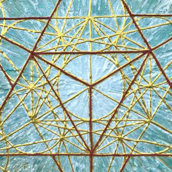 Dieses aufwendig gearbeitete Energiebild zeigt den Würfel des Metatron in goldener Farbe auf einem wunderschönen Hintergrund in Türkis mit diversen Schattierungen in Blau-Grün. Diese Farb-Nuancen entstehen durch eine spezielle Technilk, bei der immer wieder neue Farbschichten übereinander aufgetragen werden. Der Würfel des Metatron verkörpert alle platonischen Körper in sich. Der Sterntetraeder ist hier in Magenta optisch hervorgehoben. Man sagt, dass er die Energiefelder und Licht-Schwingungen aus der Umgebung aufnimmt, transformiert, speichert und wieder abgibt.